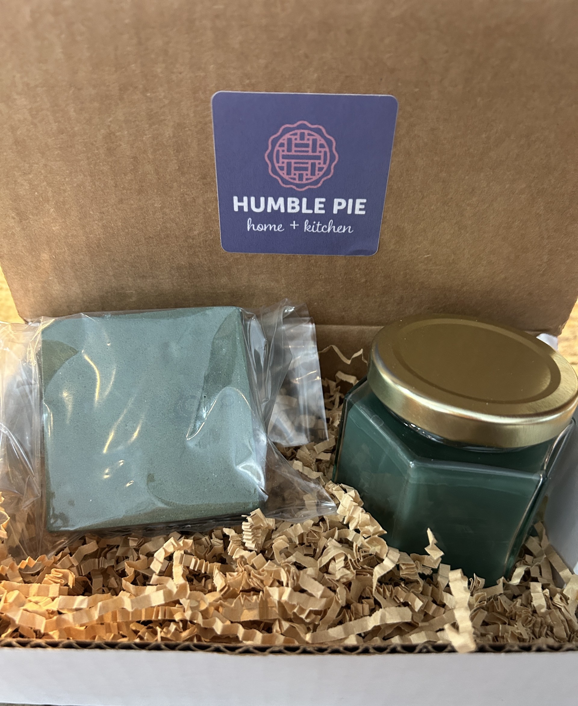 Buttermilk base melon scented soap paired with beeswax based honeysuckle scented mini jar candle.